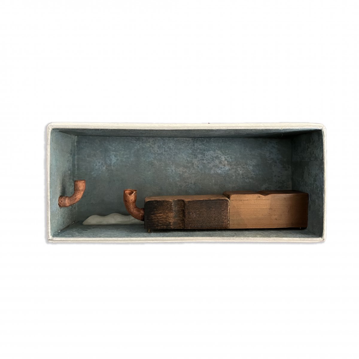 木版画、オイルパステル、鉛管、蜜蝋粘土、使われなくなった判子