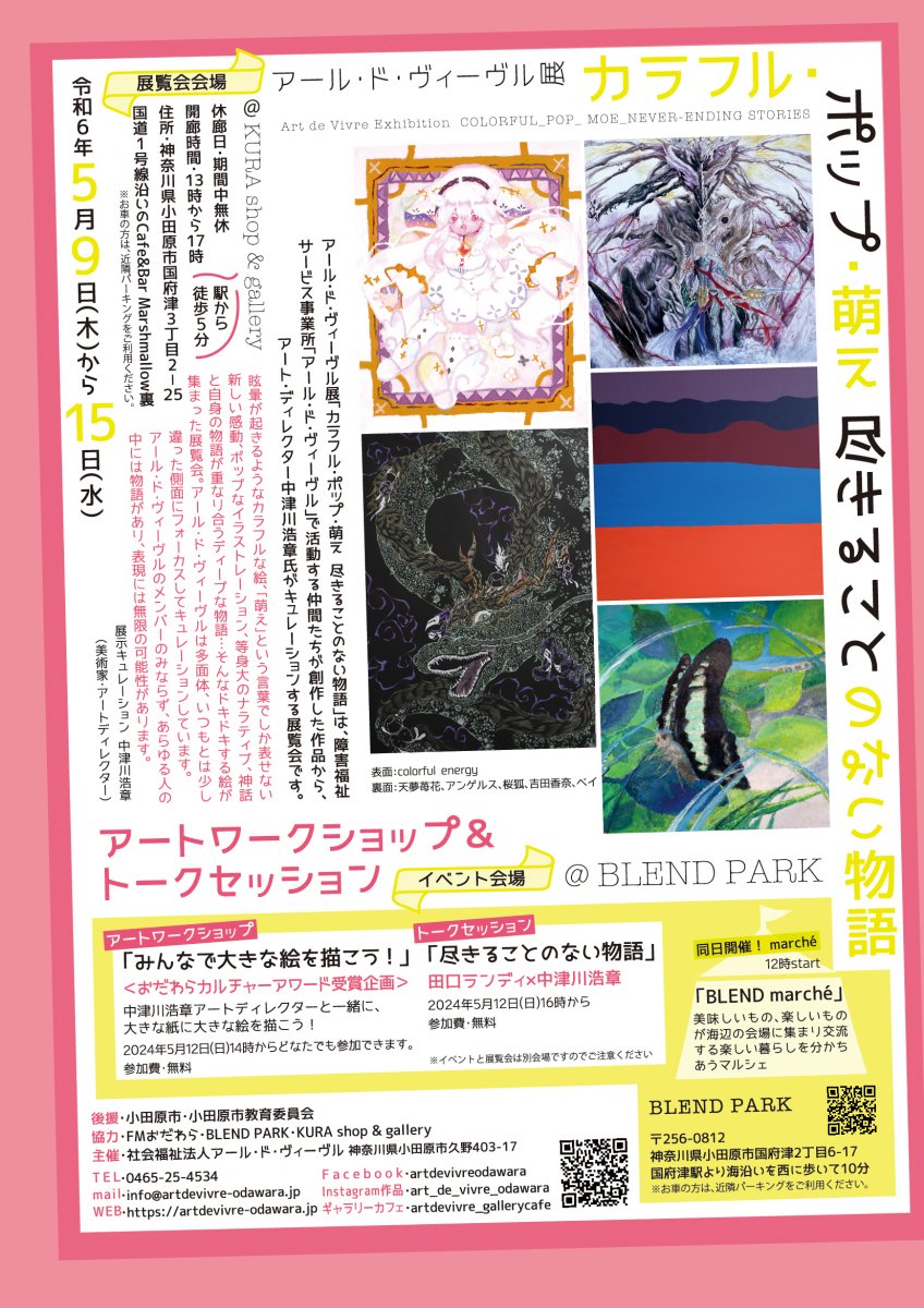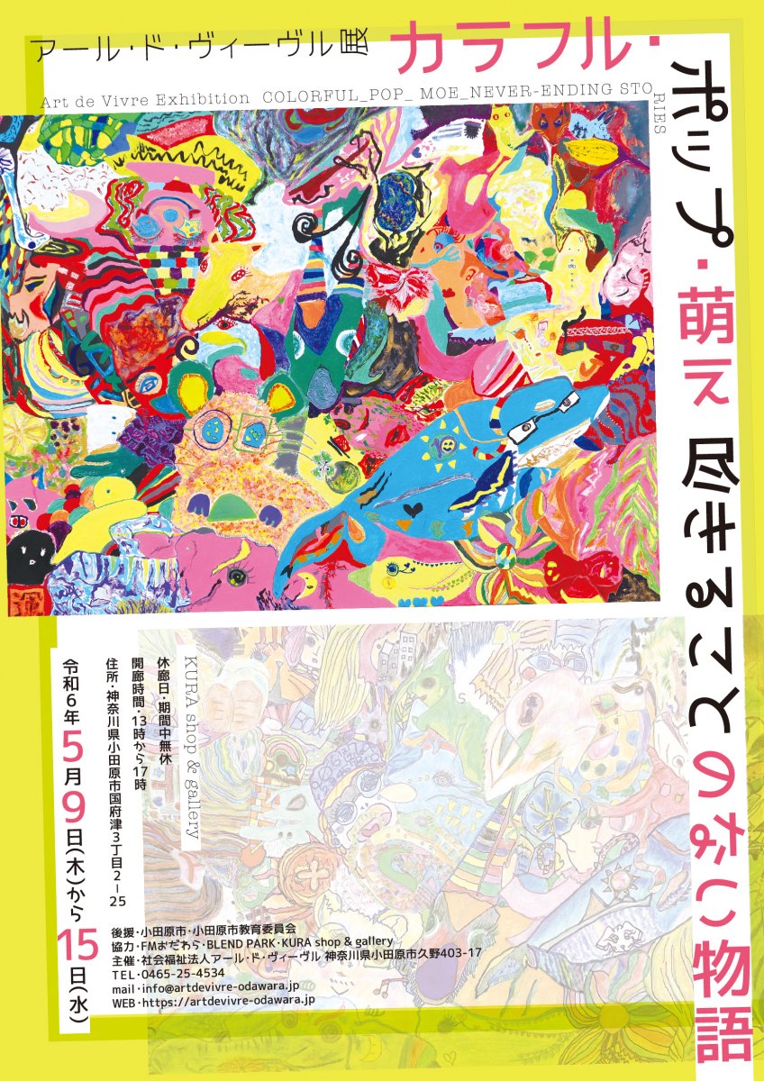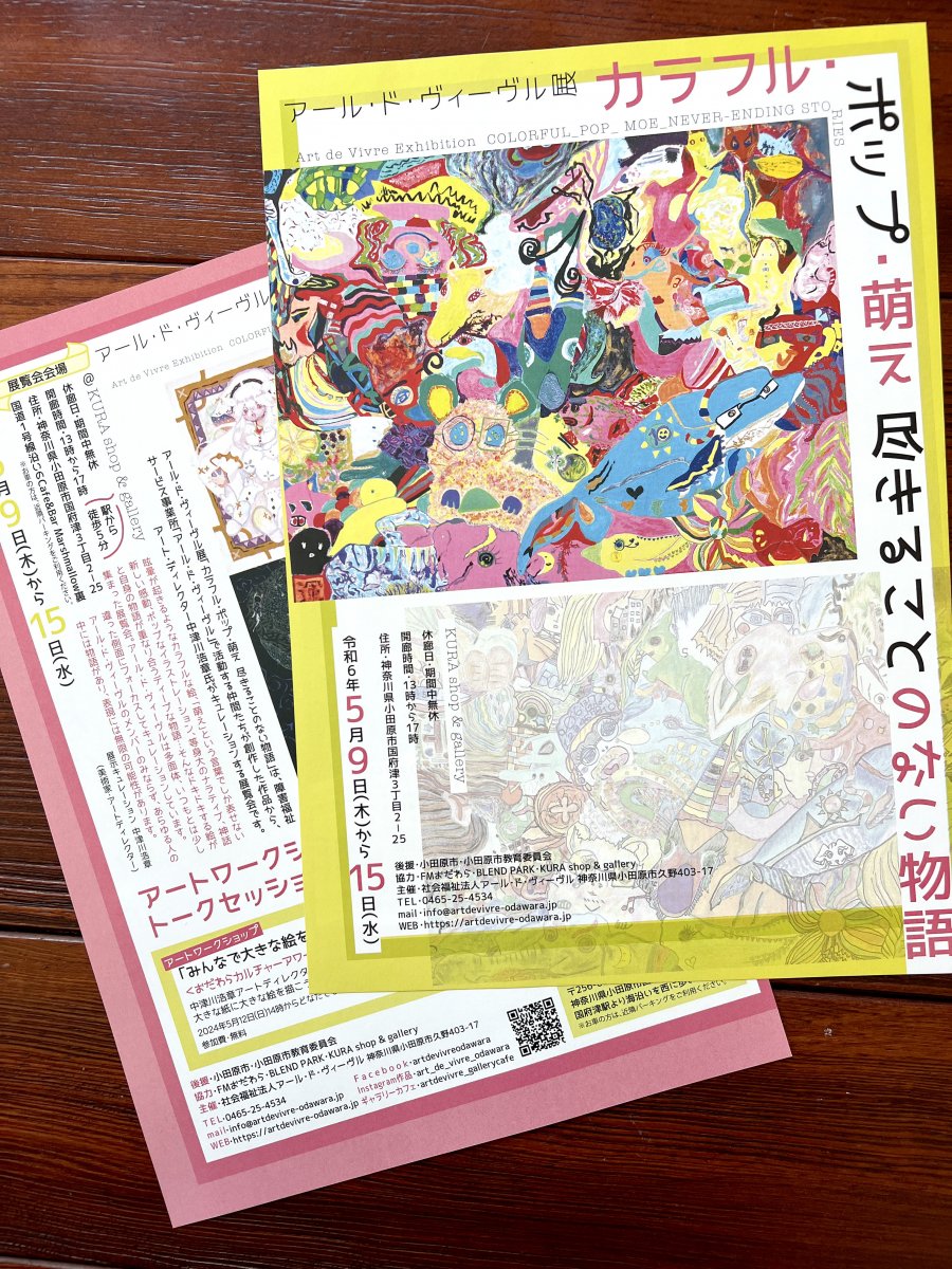 contioさん のコーディネートでアール・ド・ヴィーヴルさんに通う方たちが創作した作品展示、『カラフル・ポップ・萌え 尽きることのない物語』のチラシを作成させていただきました。