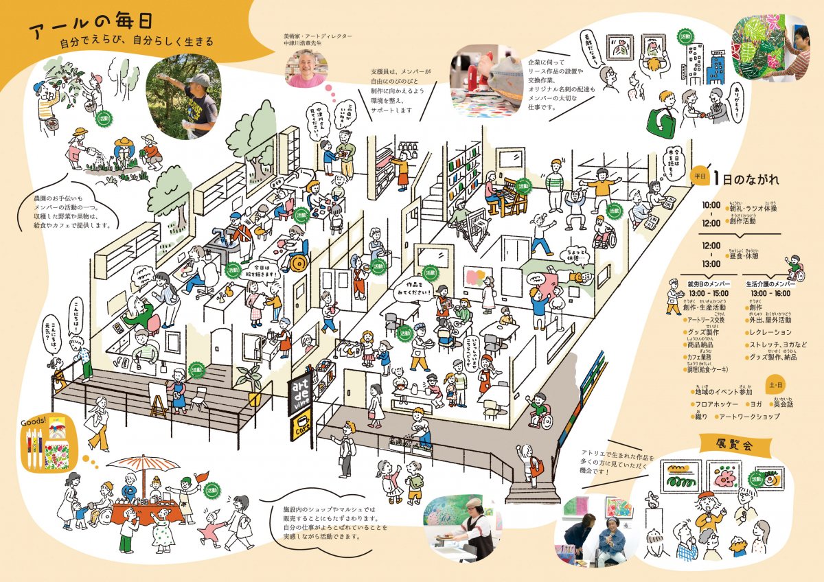 A3の6つ折になるパンフレットのデザインは、基本的にHPと共通にしていますが、中面は通所される方々の活動を通じてアールさんの雰囲気がわかりやすく伝わるようにと、アールさんとは何度かお仕事をされている、イラストレーターのウエダトモミさんが描かれた素敵なイラストメインで展開。