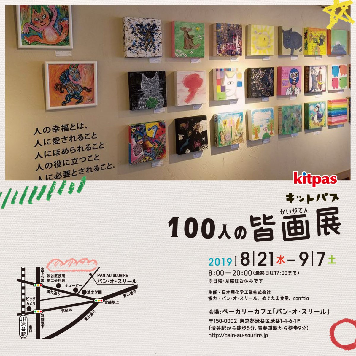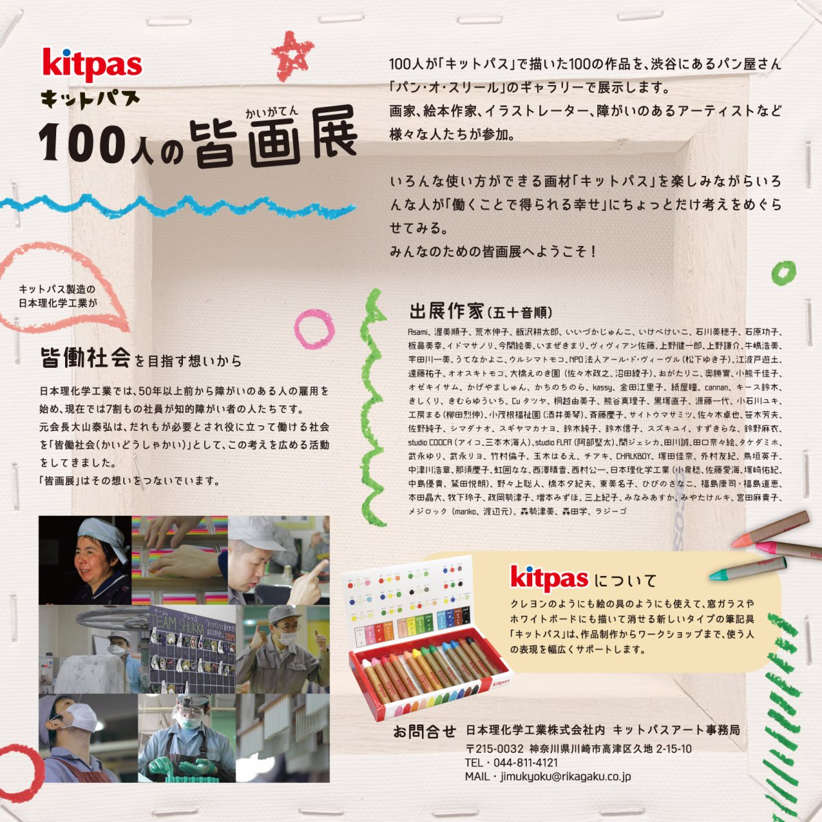 contioさん のコーディネートで、日本理化学工業株式会社主催の『キットパス皆画展 2019』(ベーカリーカフェ「パン・オ・スリール」/渋谷)のチラシをデザインをさせていただきました。