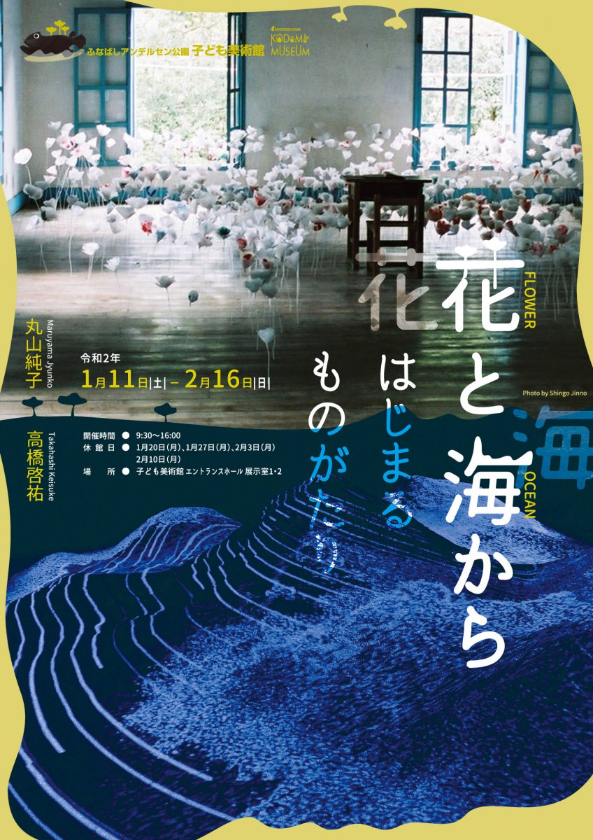 『花と海からはじまるものがたり』というタイトルで、丸山純子さんと高橋啓祐さん2人展のチラシ・ポスターをデザインいたしました。